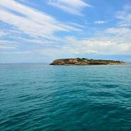 Continuando por la bahía de Voula, tu primera parada será la pequeña isla de Prasonisi, oficialmente conocida como isla de Hidrusa. Allí, podrás ponerte el equipo de esnórquel que te proporcionarán y explorar las aguas turquesas de este apartado lugar.