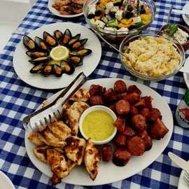 La siguiente parada será en la bahía de Vouliagmeni, cerca de la playa de Astir, un lugar ideal para sentarse, relajarse y disfrutar de una barbacoa recién preparada a bordo. El menú incluye pollo, salchichas, marisco, salsas y ensaladas griegas y un refrescante postre.