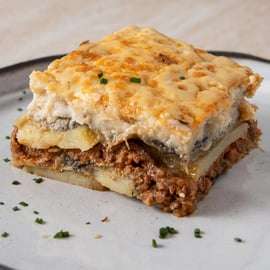 una clásica cazuela griega hecha con capas de berenjena, carne picada con especias y una cremosa salsa bechamel