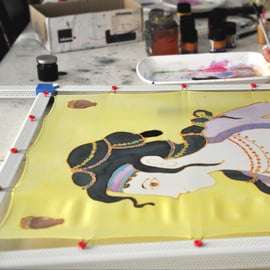 Para quienes tengan experiencia en pintura, te guiaré en el diseño de tu pañuelo basándome en un tema de tu elección. Puedes inspirarte en la mitología griega, la religión, la naturaleza y mucho más, convirtiendo tu visión artística en una obra maestra ponible.