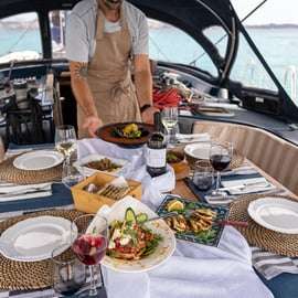 Empieza o termina un día estupendo en Atenas de la mejor manera posible, en el mar, en un velero. Disfruta de un auténtico festín griego a bordo, con 10 platos diferentes de toda Grecia, así como una copa de vino griego o una cerveza de tu elección. A bordo encontrarás una buena variedad de vinos y cervezas griegos para que puedas disfrutar de una experiencia gastronómica completa con los tesoros que nos ofrece la tierra griega. El precio incluye 2 bebidas (copas de vino, cervezas o refrescos). Después, hay un menú a tu disposición para elegir. Conoce a bordo a tu anfitrión y chef Yannis, que preparará y cocinará para ti recetas tradicionales que te harán la boca agua.