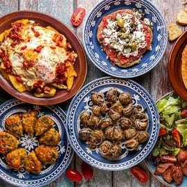 Prueba: Bougatsa, Especias y hierbas, Carne curada, Miel, Higos secos, Aceitunas, Yogur tradicional, Variedad de quesos, Ensalada de berenjenas, Tzatziki, Vino, Tsipouro, etc.
