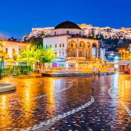Disfruta de un relajante paseo por Plaka, el casco antiguo de Atenas, con sus encantadoras callejuelas, tiendas locales y pintorescas casas bajo la Acrópolis.