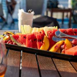 Depois de nadar, saboreie um buffet de almoço grego fresco a bordo, com opções vegetarianas, veganas, sem lactose e sem glúten. Acompanhe a sua refeição com vinho branco local, cerveja e refrigerantes à discrição, tudo incluído no seu bilhete.