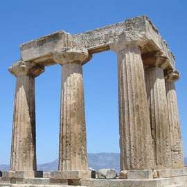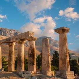 Deixa a agitação de Atenas para trás enquanto viajas para oeste ao longo das deslumbrantes estradas costeiras da Grécia em direção a uma das cidades mais poderosas da antiguidade.