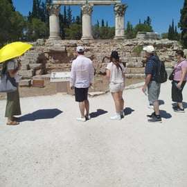 Continua até à antiga Corinto, onde o teu guia oficial dá vida a 2500 anos de história. Passeia pela extensa Ágora, que já fervilhou de comerciantes de todo o Mediterrâneo. Passa as mãos pelas colunas desgastadas do Templo de Apolo, que se mantém de pé desde o século VI a.C., um testemunho da imensa riqueza e influência de Corinto.